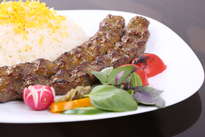 کباب کوبیده 100 گرمی 2 سیخ، برنج پخته شده 350 گرم