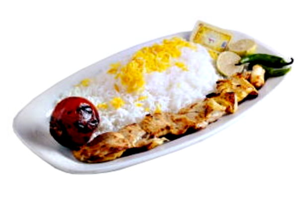 جوجه کباب 250 گرمی 1 سیخ ، برنج پخته شده 350 گرم